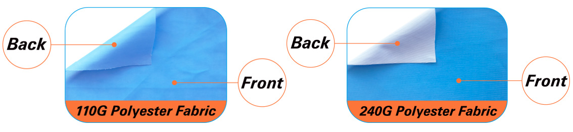 100% 110G or 240G polyerter Fabric, which saturates (dyes) the material and results in a long lasting photo-quality print that resists fading .