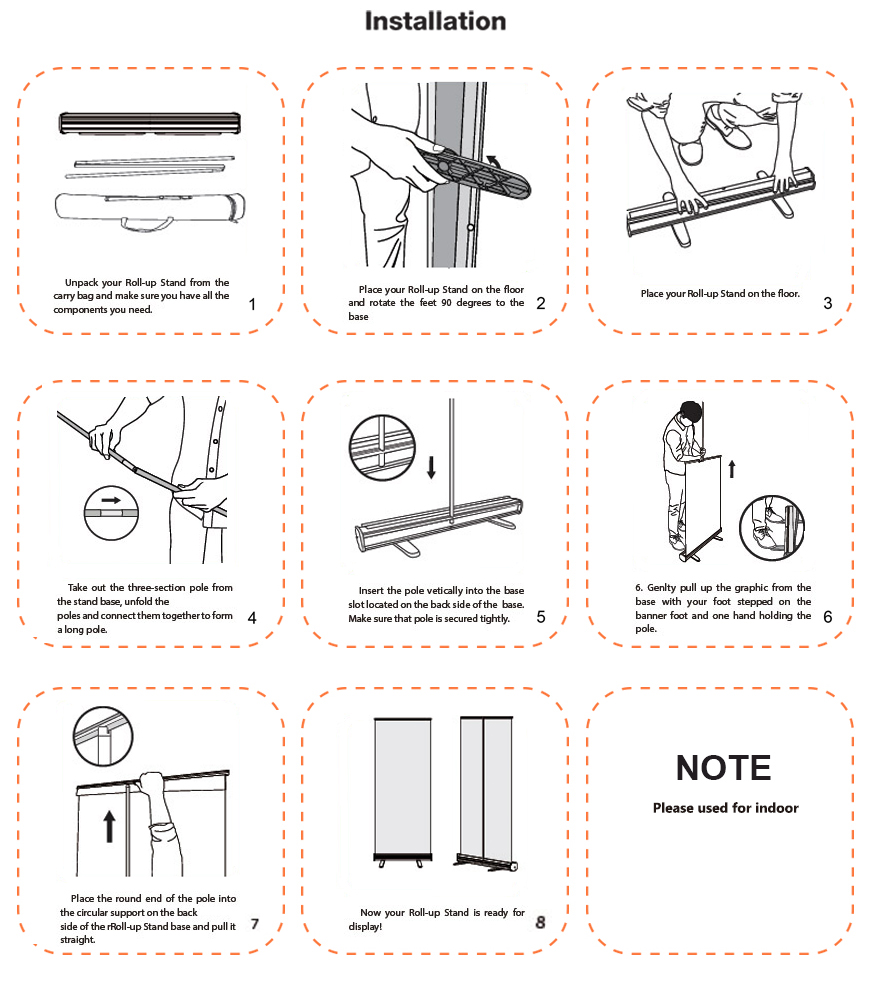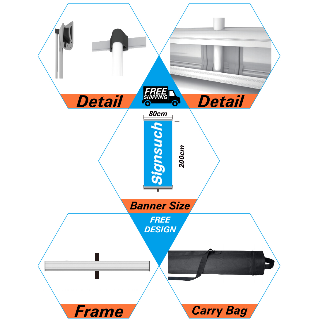 Min Order: 2Pieces ; Free Shipping : 3-7 Working days; PACKAGE INCLUDES : 1PCS: Aluminium Roll Up Frame ; 1PCS: High-Resolution Graphic Print; Size: 80x200CM;