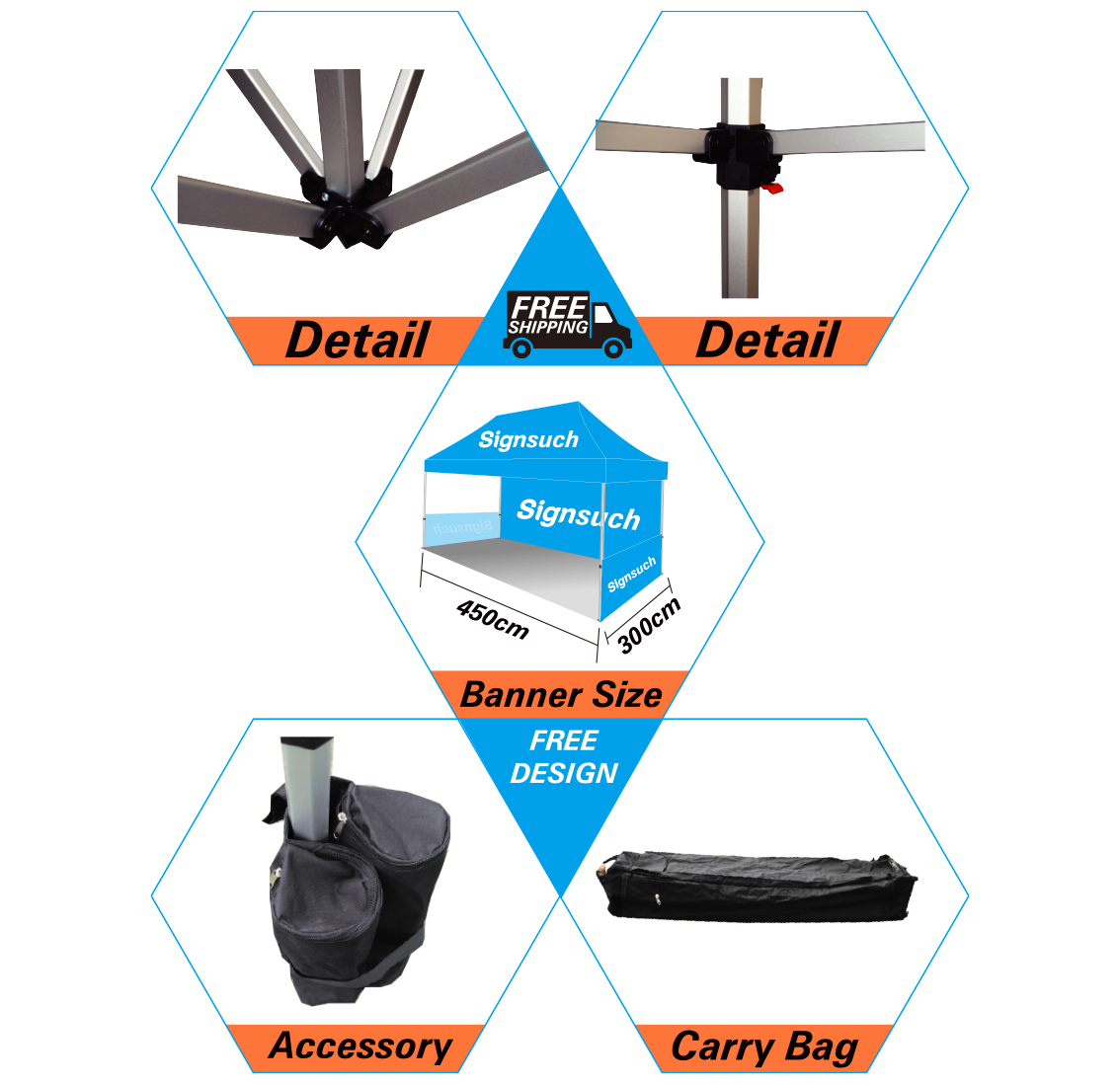Standard Price Include : Hexagonal Aluminum Frame and 600D Oxford Fabric Custom Canopy with Printing Selected, 600D Oxford Fabric Custom Wall with Printing Selected, Carry bag & Stakes & Sand bag Selected