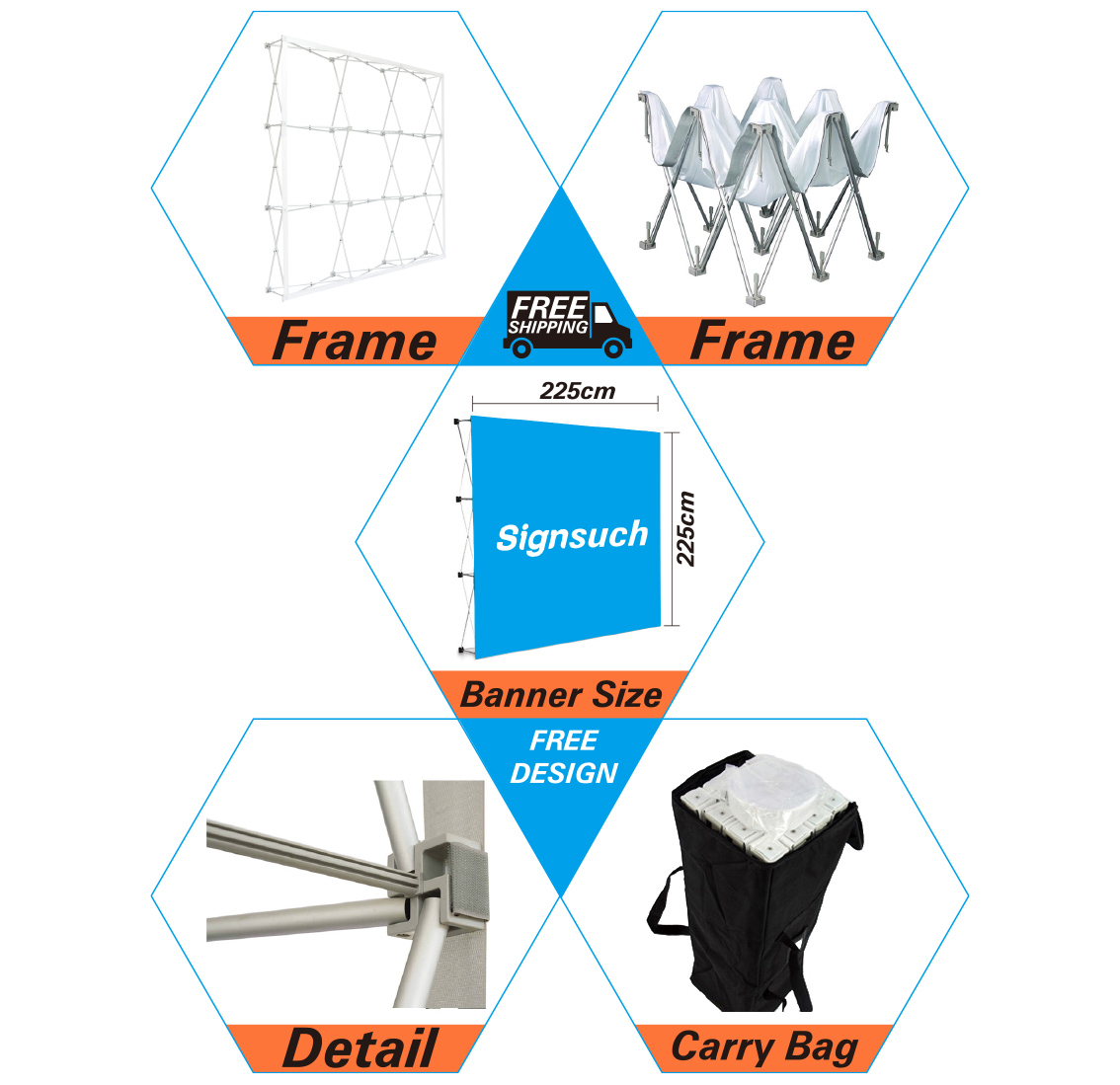 Custom graphics attach to the frame with Velcro? adhesives, while printed end caps offer a polished look.