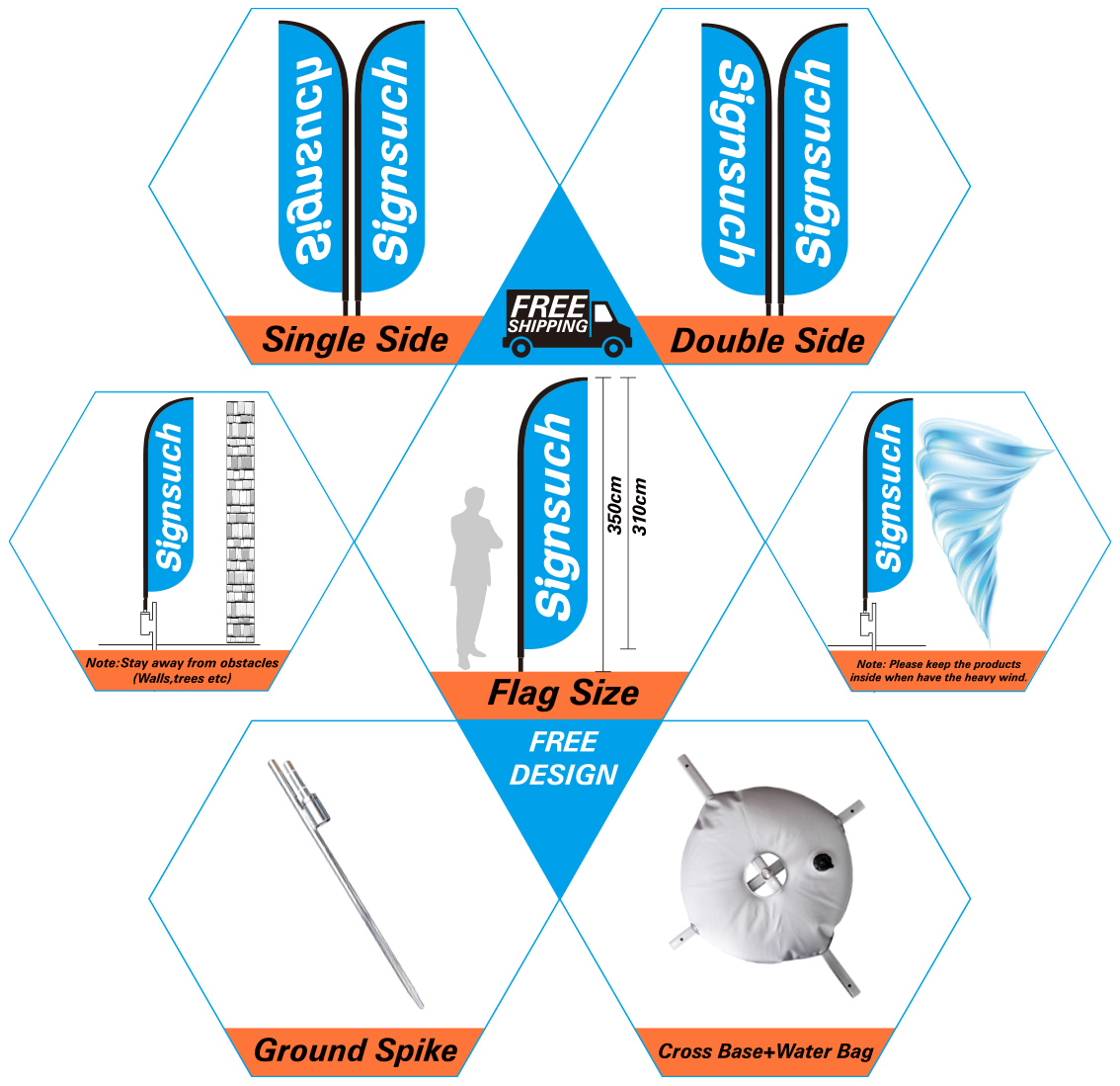 Standard price include 4Kits fiberglass poles; 4Kits flags with single side printing (different design for each flags or the same); 4Kits spike bases ; 4Kits Simple Carry Bag Free Shipping : 3-7 Working days;Single and double sided graphics available ;Indoor and outdoor baes available;The flags can rotate in the wind ;
