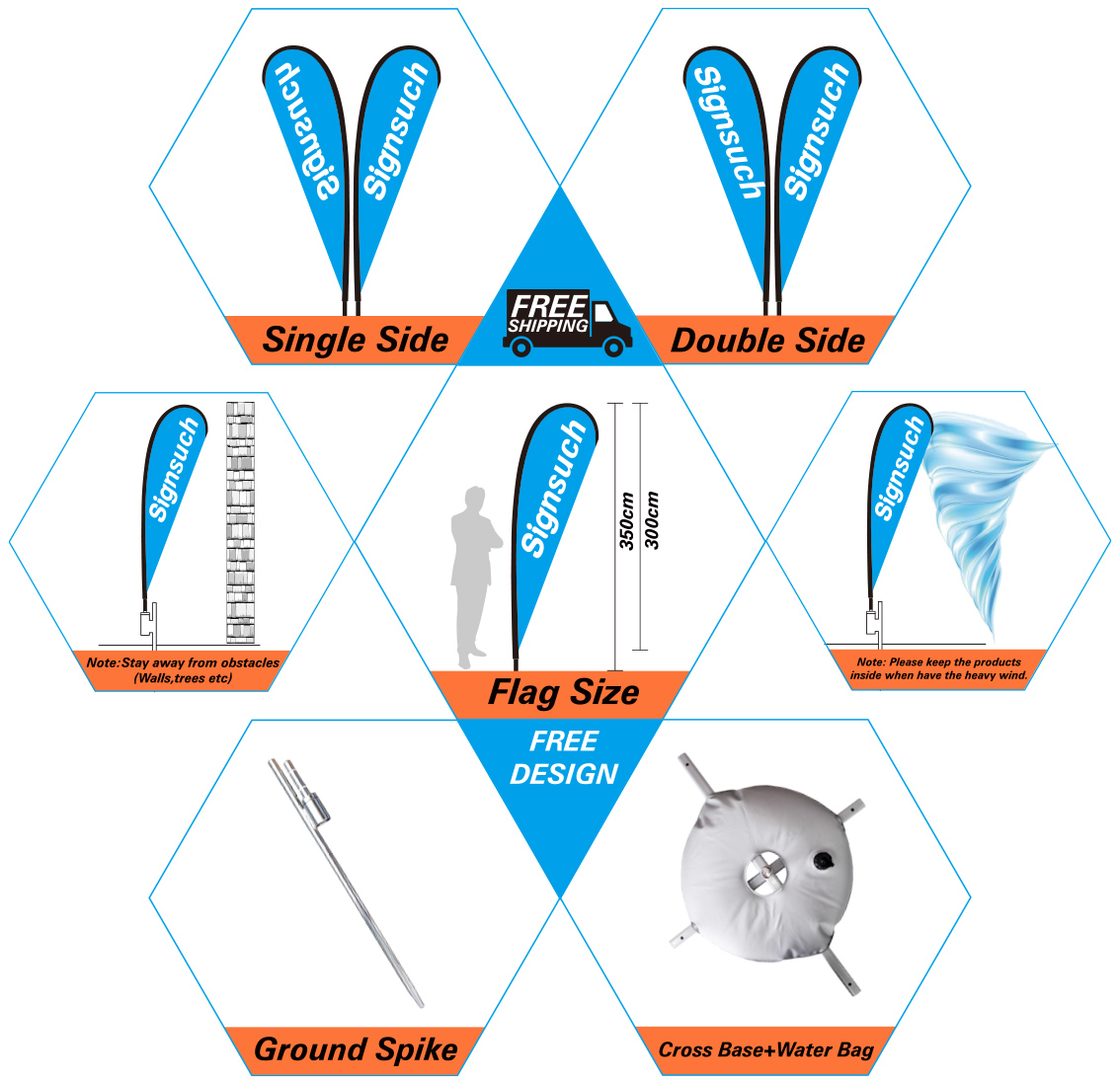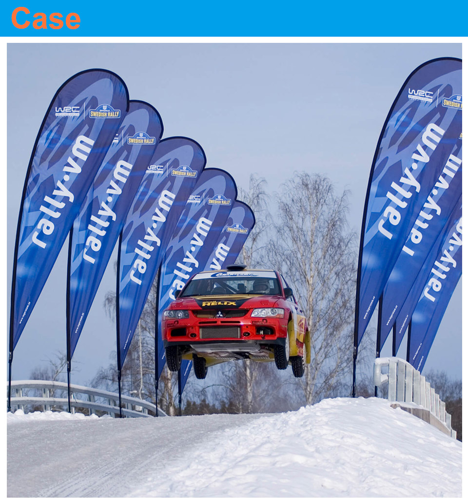 Standard price include 4Kits fiberglass poles; 4Kits flags with single side printing (different design for each flags or the same); 4Kits spike bases ; 4Kits Cimple Carry Bags ; Free Shipping : 3-7 Working days;Single and double sided graphics available ;Indoor and outdoor baes available;The flags can rotate in the wind ;